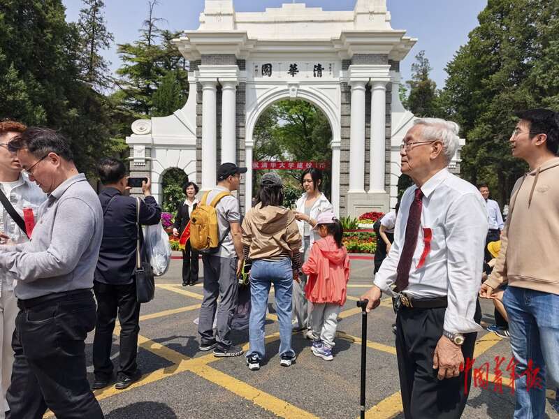 4月25日,北京,清华大学,冶金系1960级校友颜金科(前右二)在二校门前驻足凝望。4月25日、26日是清华大学建校115周年的校友返校日,不少校友从全国各地及海外返回母校,重温在校的学习和生活时光,在熟悉的建筑与草木间,寻找那个曾经意气风发的自己。中青报·中青网 陈剑/摄