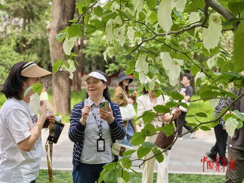 4月25日,北京,清华大学,校友在花形酷似白鸽的珙桐树边拍照。中青报·中青网 陈剑/摄