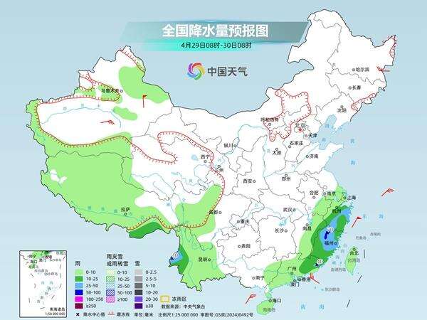 后天,新疆北疆北部阿勒泰山区局地有小雪或雨夹雪。浙江中南部、江西东部、福建、广东东部以及云南西部、西藏东南部等地部分地区有中到大雨,其中,福建西北部等地局地有暴雨。