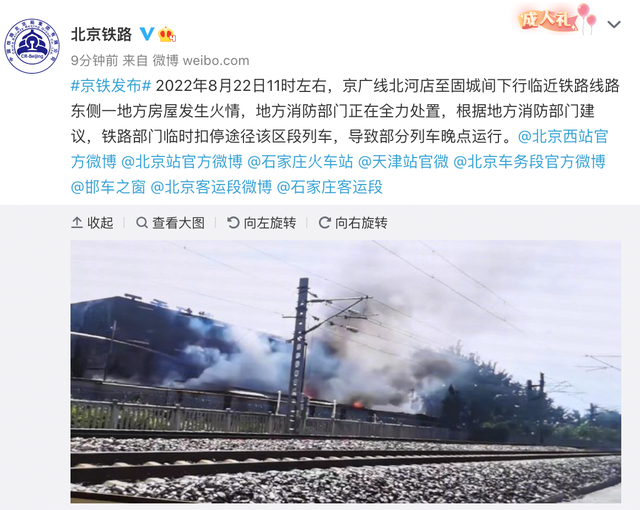 2022年8月22日11时左右,京广线北河店至固城间下行临近铁路线路东侧一地方房屋发生火情,地方消防部门正在全力处置,根据地方消防部门建议,铁路部门临时扣停途径该区段列车,导致部分列车晚点运行。