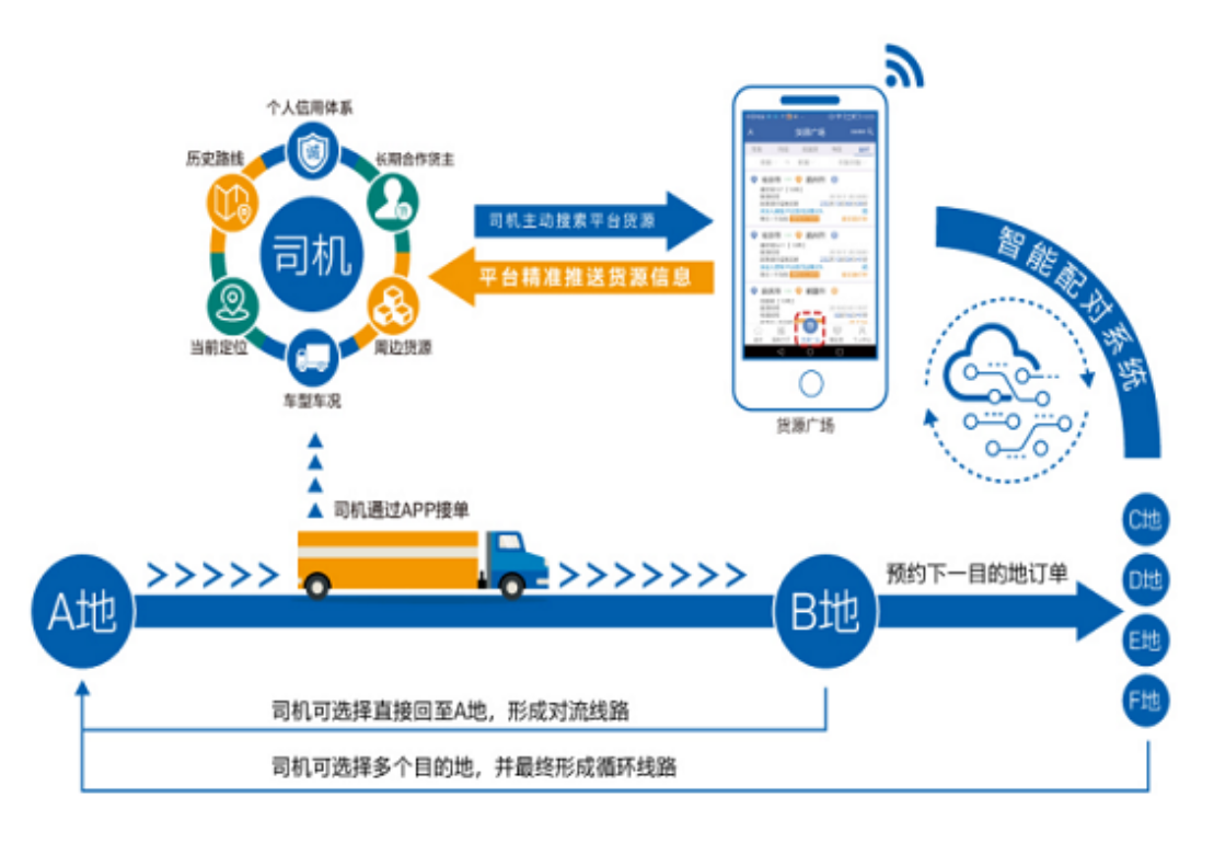 数据显示,平台的“智能配对”业务平均可为企业降低近10%物流成本,为司机节约69%的货源寻找时间。