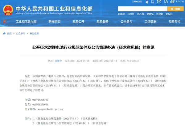 中国经济网北京5月9日讯(记者 郭跃)昨日,工业和信息化部公开征求《锂电池行业规范条件(2024年本)》、《锂电池行业规范公告管理办法(2024年本)》(征求意见稿)意见。
