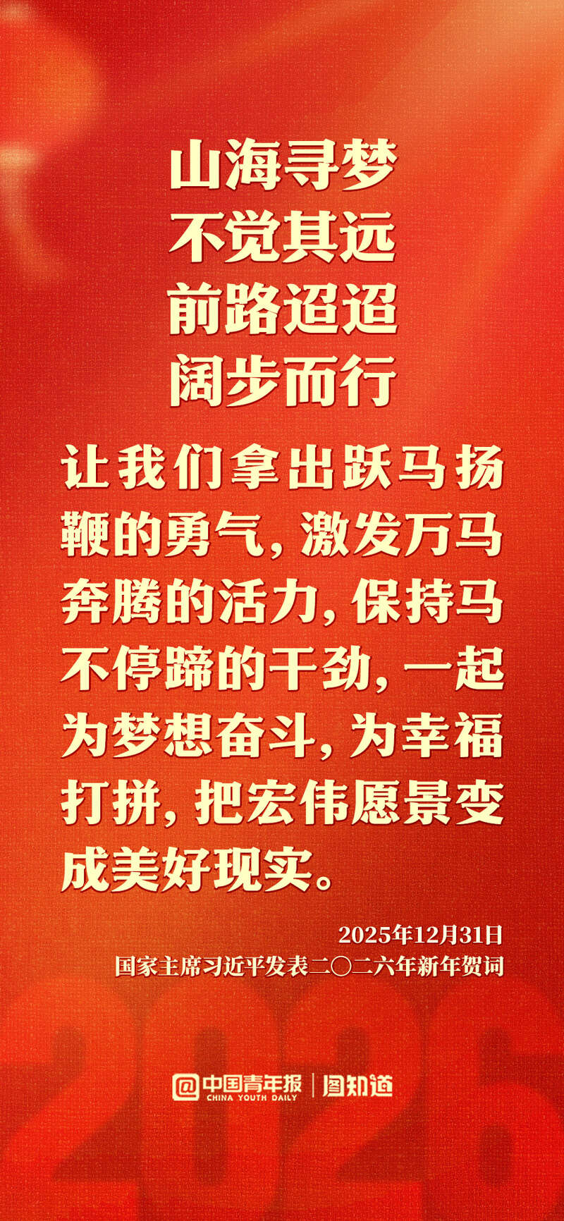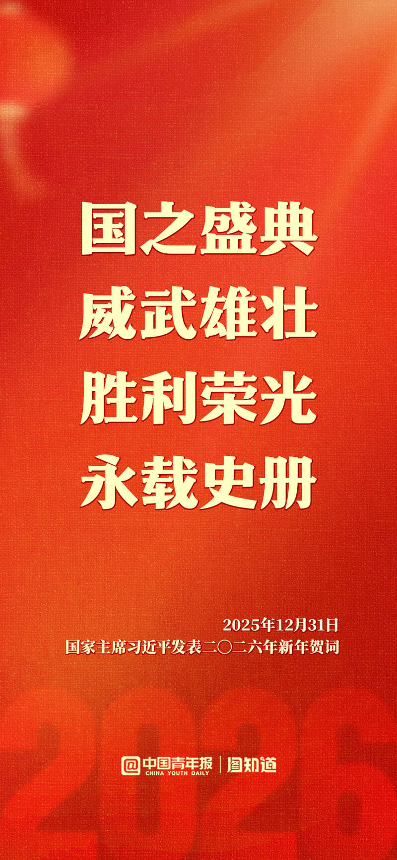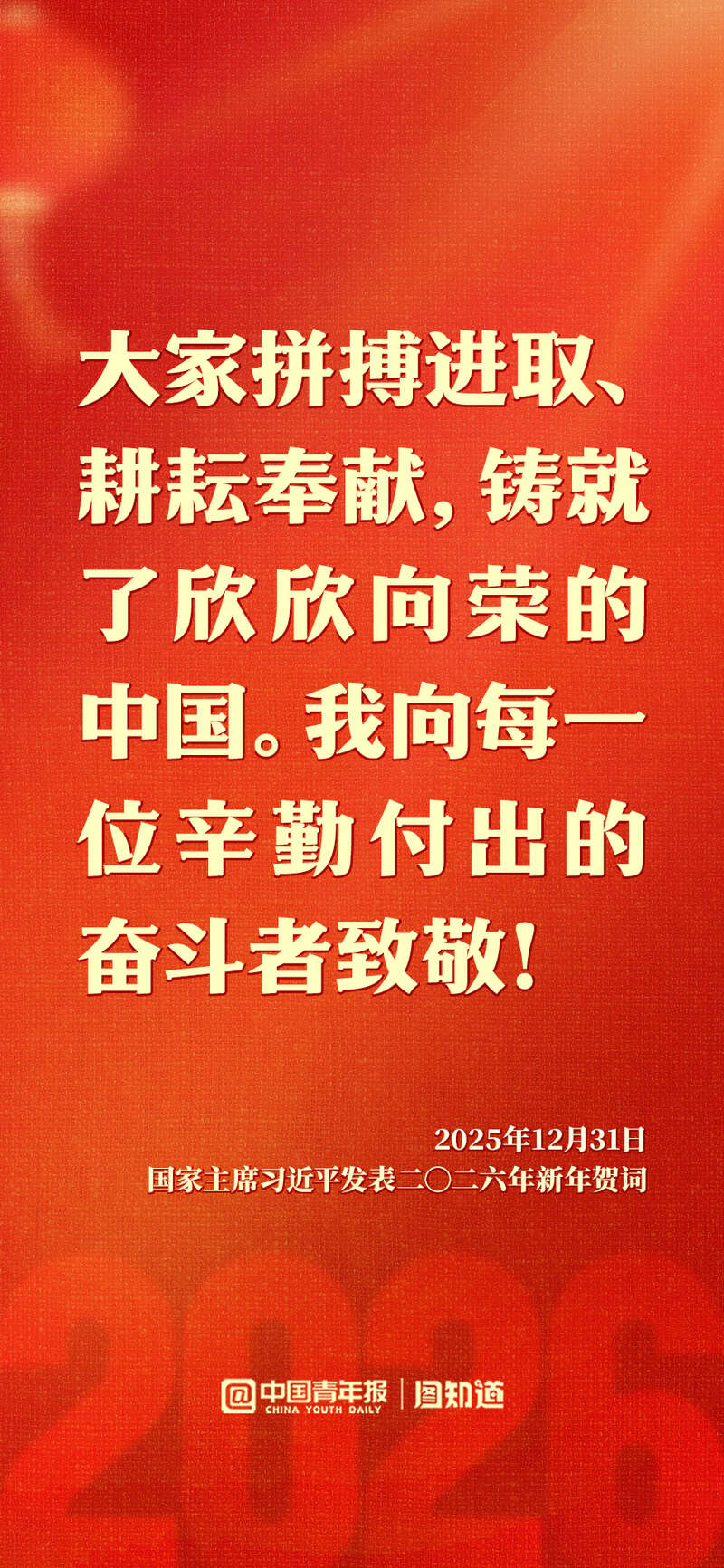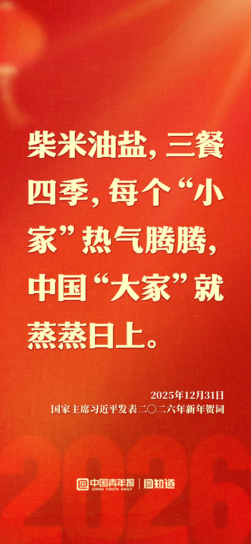 中国青年报客户端 | 2025-12-31 22:30新年前夕,国家主席习近平发表二〇二六年新年贺词。“每个‘小家’热气腾腾,中国这个‘大家’就蒸蒸日上。”家国共此时,让我们带着这份温暖与力量,携手奔赴2026。