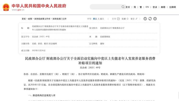 我国全面向中度以上失能老年人发放养老服务消费补贴
