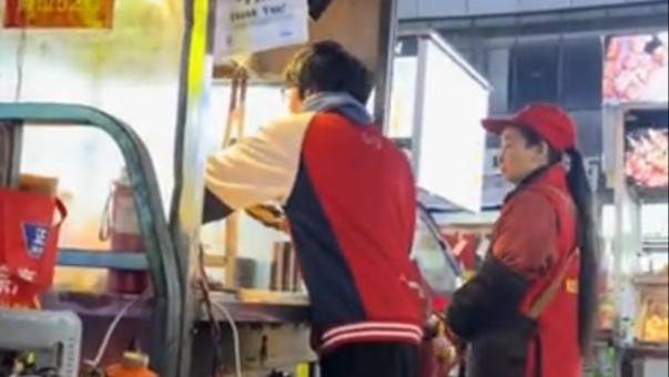 China Heartbeats | A boy in his school uniform helping his mom at her snack stall