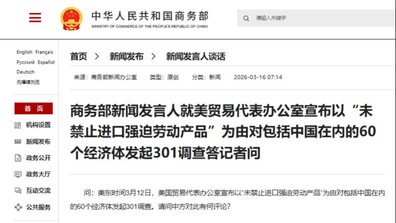 美宣布以“未禁止进口强迫劳动产品”为由对中国在内60个经济体发起301调查,商务部回应