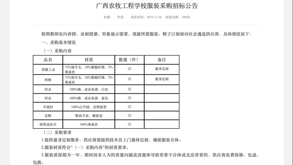 广西一中职学校7.7万采购22套服装引质疑,招标负责人称采购合规