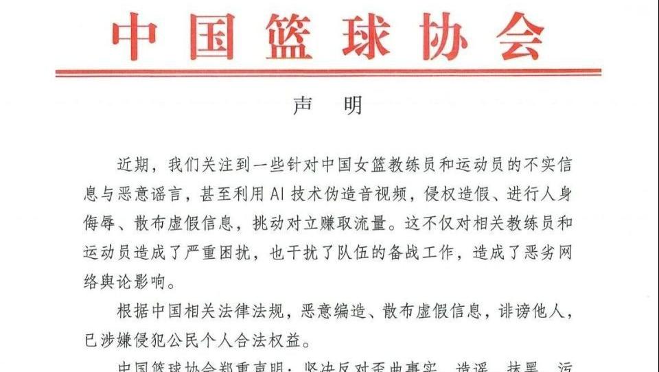 中国篮球协会声明:坚决反对造谣、抹黑女篮教练和运动员行为