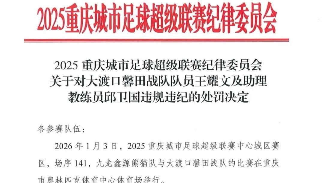 官方通报渝超联赛冲突:一队员袭击裁判头部被禁赛5年
