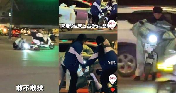 有人在马路上摔倒,路过的俩学生毫不犹豫将其扶起。#骑乘电动自行车请佩戴安全头盔