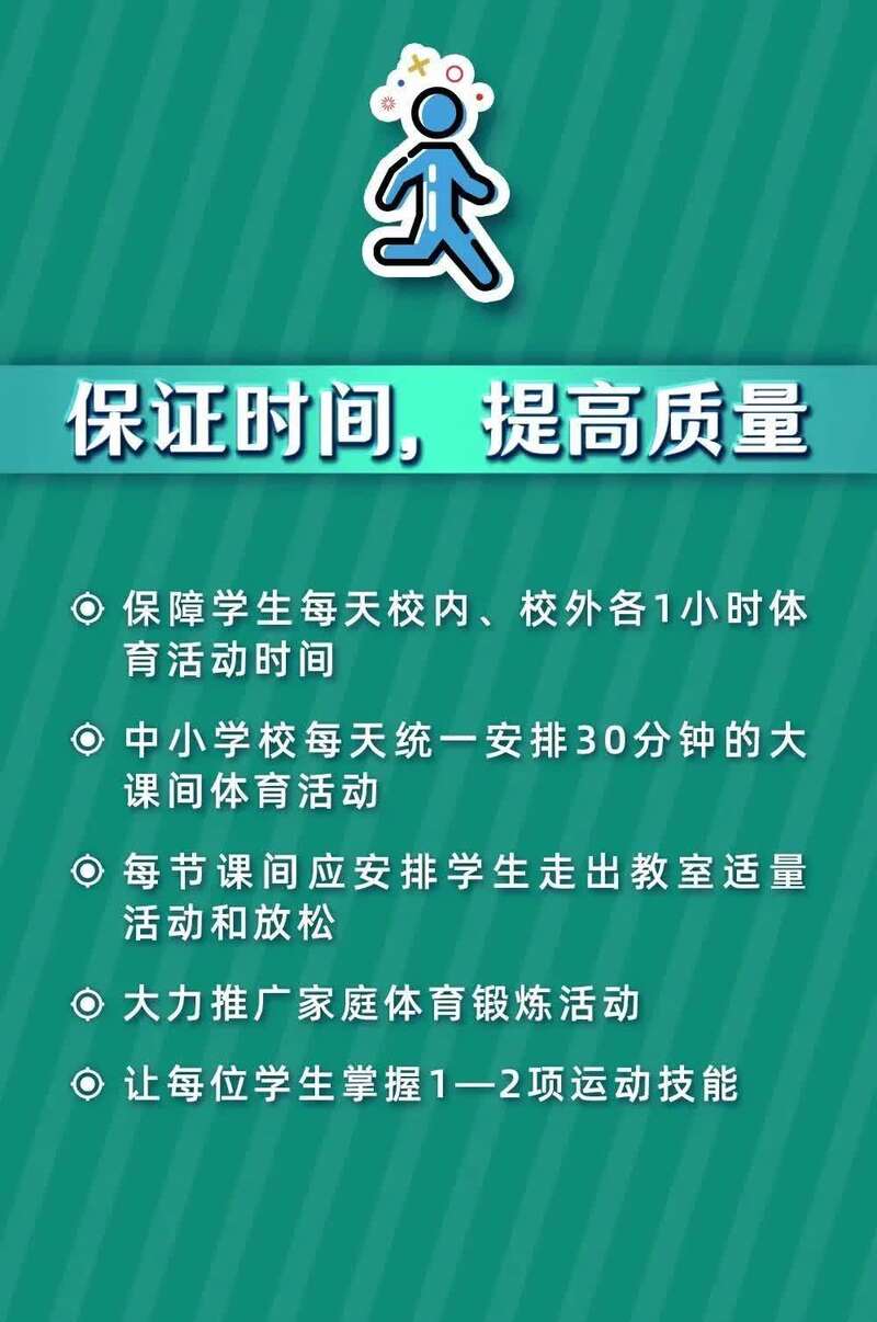 着力保障学生每天校内、校外各1小时体育活动时间;大力推广家庭体育锻炼活动
