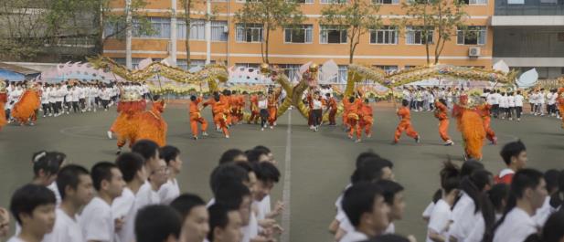 学生练习舞龙铜梁二中校长说:“自己民族的东西是最有价值的东西,是根深蒂固的东西,是最能够影响人们思想和行为的东西。我们必须把我们自己的文化传承好、发展好。在坚守的过程中学会融会贯通,增强我们的自信,这样传承的力量就得到了真正的体现。”