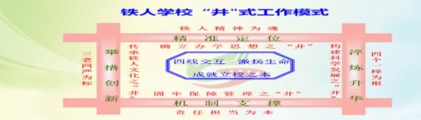 经过多次研究,探索构建出铁人学校“明确定位、创新举措、提质见效”的9个部门井式工作模式,努力打造“高效课堂、礼仪校园、名师群体、铁雅德育”四张名片,制定了具有铁人精神特质的《爱集体 做适应环境的小铁人》《爱师长 做感恩自立的小铁人》等一至九年级的“铁雅”德育校本教材,并将校本教材与主题班会、升旗仪式等有机结合。让教育烙上浓浓的铁人印记,让铁人精神为学校发展注入动力和活力。
