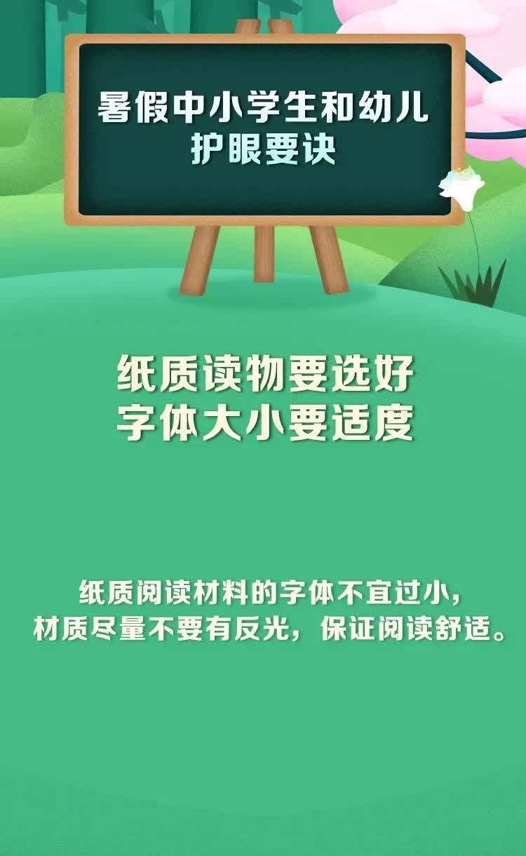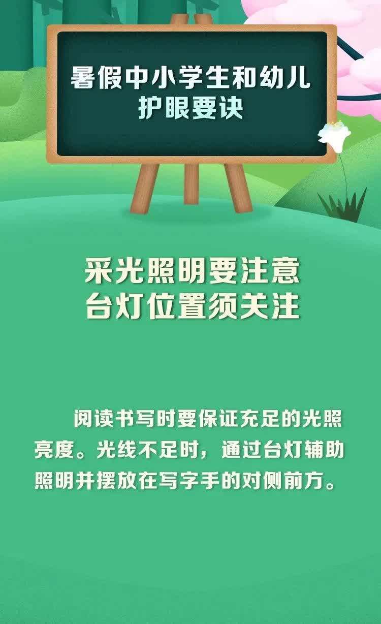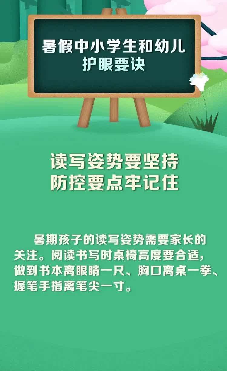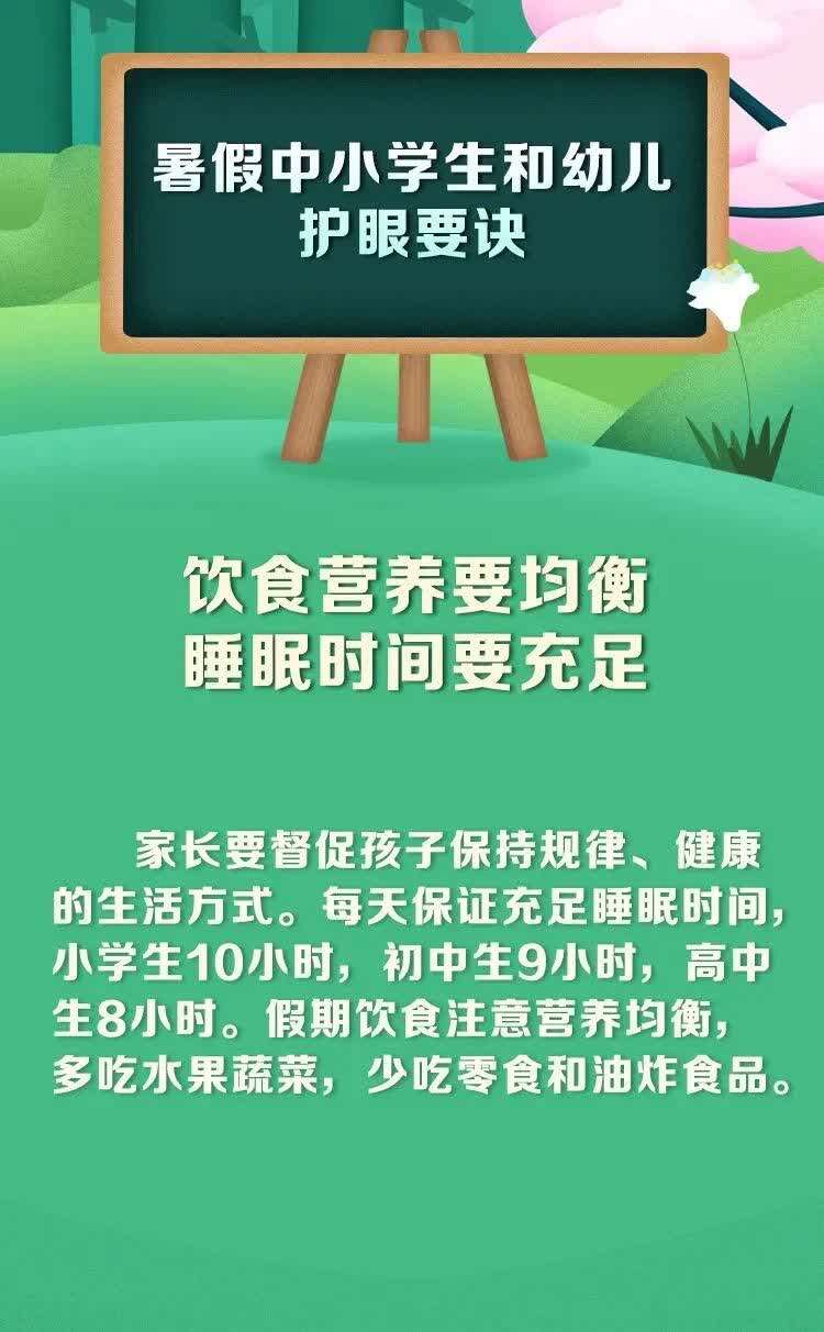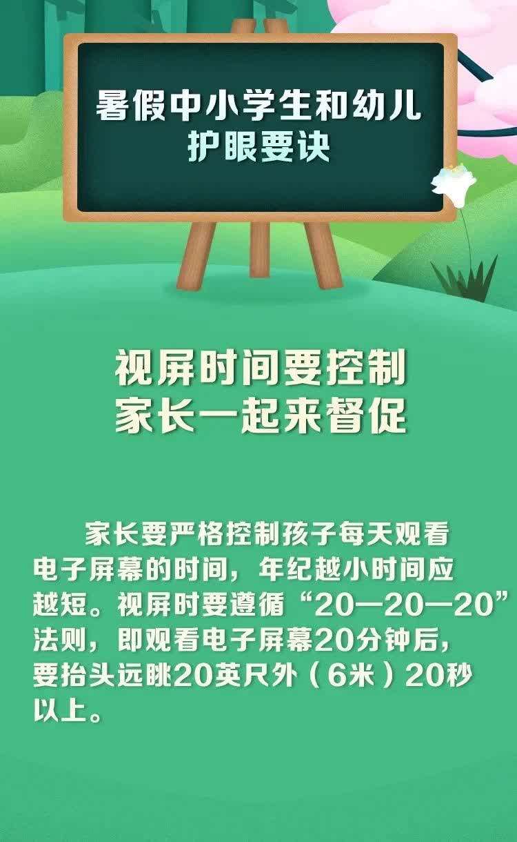 2021年暑假来临之际,教育部指导全国综合防控儿童青少年近视专家宣讲团,提出2021年暑假中小学生和幼儿护眼要诀,倡导广大中小学生和幼儿假期科学合理安排好生活、学习,科学健康护眼。一起看要诀大图——