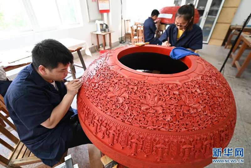 7月27日,福建省红门漆艺术研究院工作人员在制作福州雕漆作品过程中的雕剔工艺程序。