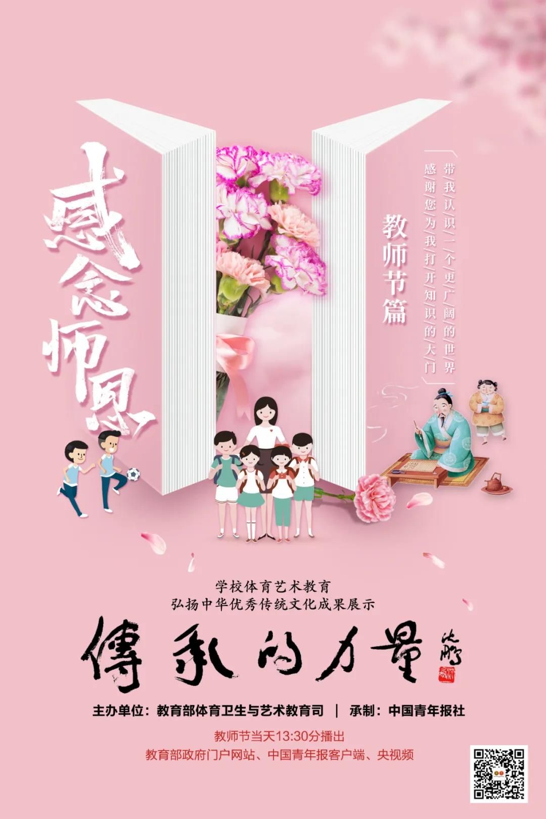 《传承的力量》教师节篇展示学校体育艺术教育成果,将多所学校的传承文化经典故事向我们娓娓道来。节目将在 9月10日 教师节当天播出,登录教育部政府门户网站、中国青年报客户端可同步观看。