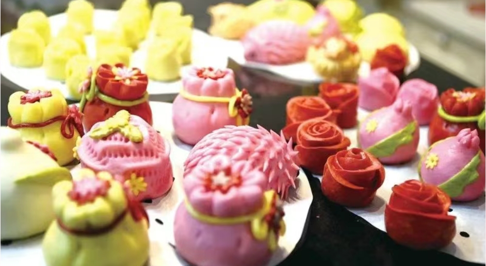 只见卢芸将一块块面团,经揉、捏、搓、拉、盘、剪等手法,片刻间便化作惟妙惟肖的喜鹊、玫瑰花、福袋、石榴等造型的花馍。“七夕节是中国传统节日,寓意美好。今天做的‘比翼鸟’‘玫瑰花’花馍,都是契合节日氛围的作品,我想用这种方式传承非遗技艺。”卢芸介绍。