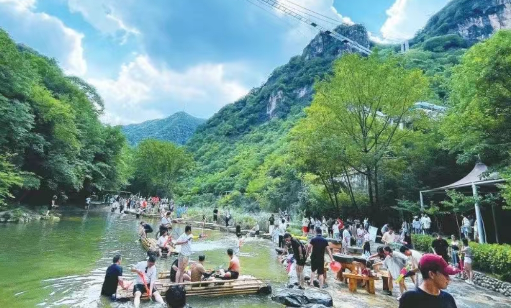 “受七夕与暑期叠加效应影响,目前景区日均接待已超1500人次,已累计接待旅行团近百个。”五龙河景区工作人员肖燕介绍,“织女谷”景点最受青睐,游客在此沉浸式感受牛郎织女爱情传说,参与民俗互动、拍照打卡,现场欢声笑语不断。为应对客流高峰,景区增派人员、强化安全保障,还推出七夕祈福、篝火晚会等特色活动,全方位提升游客体验、烘托节日氛围。