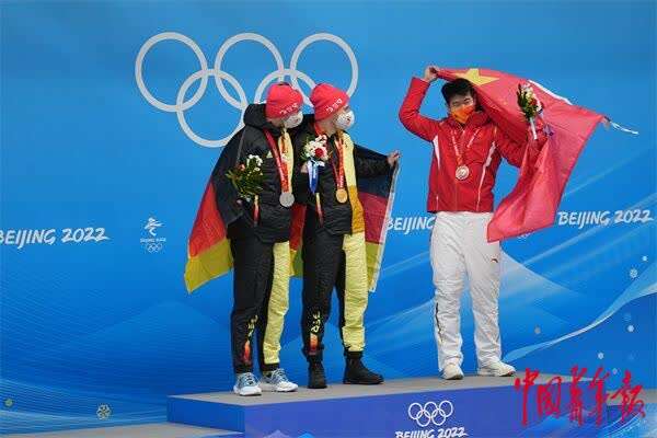 事实上,当闫文港完成自己的所有比赛时,他并不能确定自己能不能走上领奖台,几分钟后,当俄罗斯奥运队运动员特列季亚科夫的成绩锁定在了4分01秒99,闫文港意识到,自己创造了历史,拿下获得了北京冬奥会男子钢架雪车项目的铜牌。