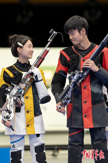 如何在出圈带来的关注度和日常需要的专注度之间保持平衡?盛李豪似乎没有这样的困扰,他对中青报·中青网记者表示,“比赛中,尤其在决赛阶段,现场会有非常多的情况和信息干扰我们,但最终,我们都会专注于去想自己的技术动作,然后果断执行自己的决定,这种长期积累的集中注意力的能力,也能用到赛场之外,是非常宝贵的能力。”更重要的并非是持续保持专注,而是当注意力分散导致问题出现后,自己能否及时发现问题,并调整解决。在男子10米气步枪决赛中,最后时刻,盛李豪打出9.8、9.9环的成绩,但很快他又能用10.5环以上的表现稳定局面。和东京奥运会上初出茅庐、逆袭摘银的少年相比,3年过去,盛李豪已经成长为集世锦赛、世界杯、亚运会、世界纪录多项荣誉集一身的“老队员”,出手更沉着,临场更冷静。