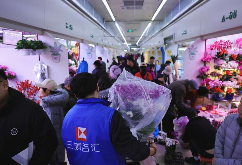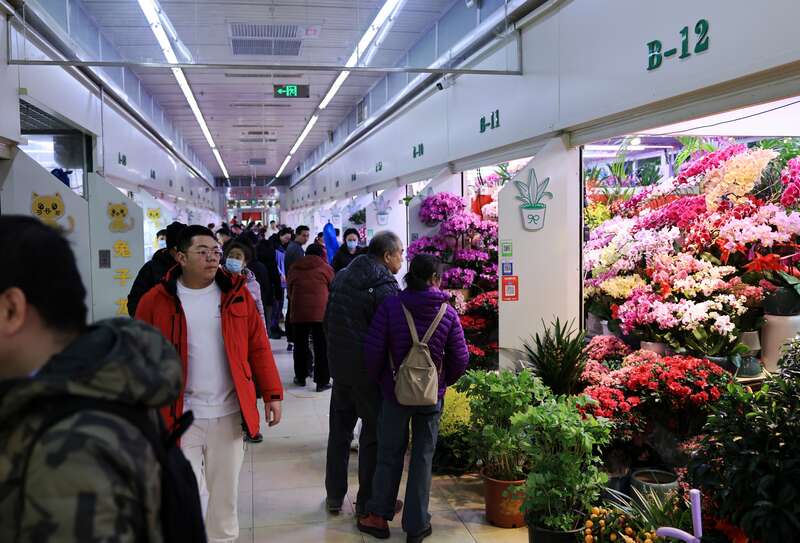 2026年2月10日,临近春节,北京鲜花市场供销两旺。图为北京海淀区西三旗花市里顾客正在选购鲜花。(中青在线记者 于璧嘉/摄)