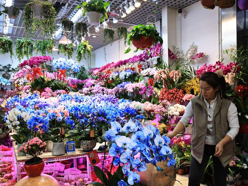 众多花卉中,富有美好寓意的品种尤其受欢迎。在花商刘女士的摊位上,各色兜兰开得正盛。“每天能卖出几十盆,比月初翻了几番。”她笑着说,“很多顾客冲着‘兜住福气’的好彩头来买,每年春节前都是这样。”