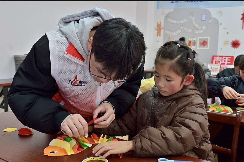 课堂上,孩子们在大学生志愿者老师的帮助下,忙着制作“年年有余”挂饰。红色卡纸剪成鲤鱼形状,一张张圆形卡纸对折成鱼鳞贴在鱼身上,再用彩色方形卡纸折成扇子作鱼尾。有个小男孩举着自己做的鱼,得意地向旁边的小伙伴炫耀:“你看我的鳞片,排列得整齐不?”旁边的小姑娘却皱着眉头,认真往鱼身上涂胶水:“我这个尾巴怎么立不起来?”