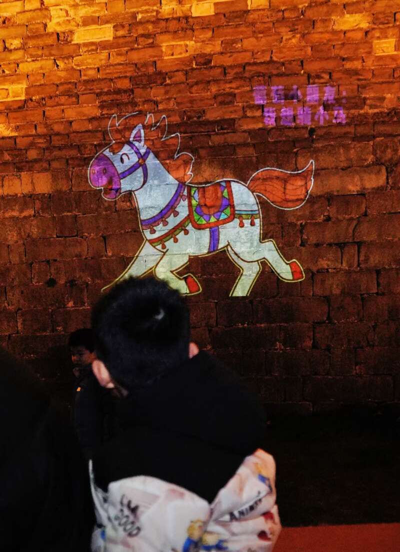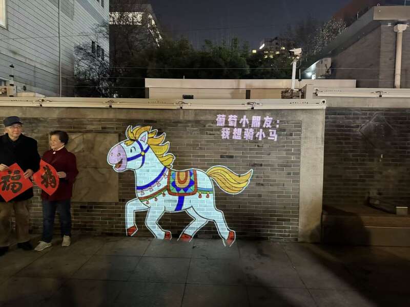 一群孩子轮流坐在这辆“战马”车上,看着自己画的马在墙上“跟”着自己跑,兴奋地挥舞双手。光影流动间,夜跑的市民停下了脚步,拍照的年轻人举起了手机。