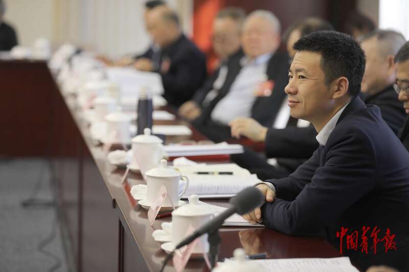 3月9日下午,北京会议中心,全国政协十四届四次会议科协界别小组会,全国政协委员、中国航空工业集团首席技术专家李志强(中)发言。中青报·中青网记者 陈剑/摄