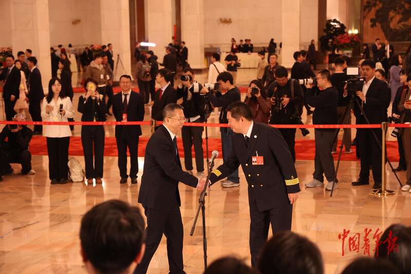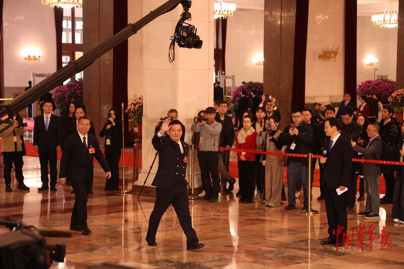 3月9日上午,北京人民大会堂,十四届全国人大四次会议第二场“代表通道”上,全国人大代表、中国远洋海运集团高级船长倪迪(前)挥手致意。当日上午,2026年全国两会第二场“代表通道”在人民大会堂开启。中青报·中青网记者 王鑫昕/摄