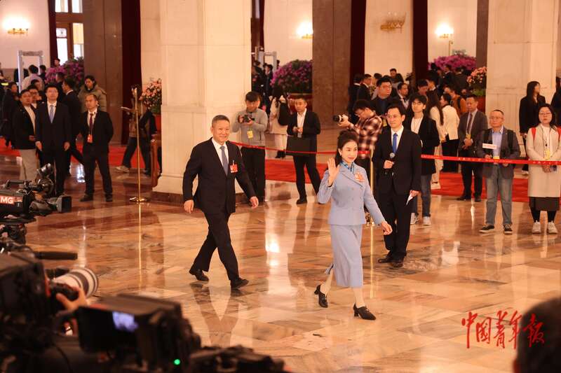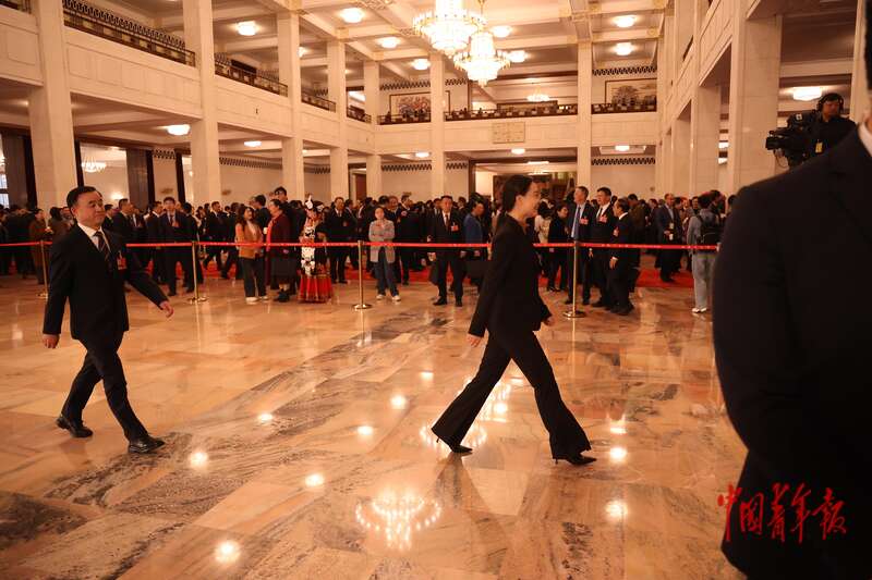 3月9日上午,十四届全国人大四次会议第二场“代表通道”集中采访活动在人民大会堂举行。结束采访后,全国人大代表顾雪(前)和周琪离开“代表通道”。中青报·中青网记者 王鑫昕/摄