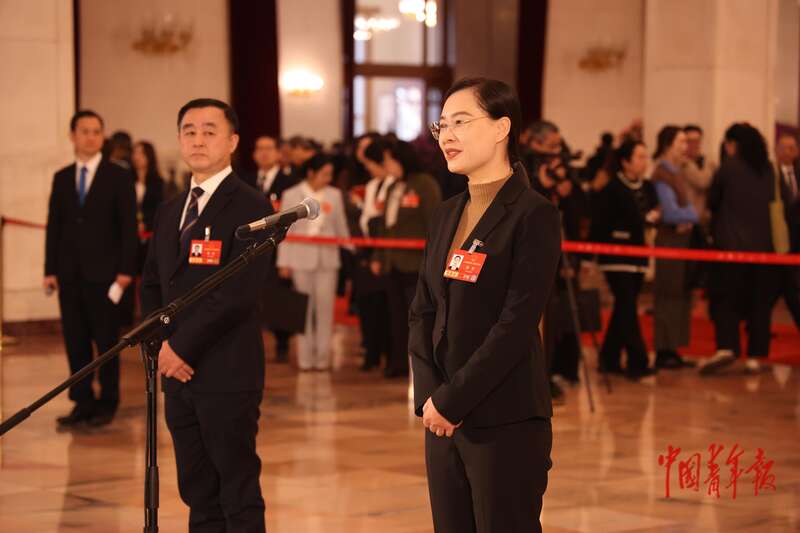 3月9日上午,十四届全国人大四次会议第二场“代表通道”集中采访活动在人民大会堂举行。全国人大代表、河北省衡水市医疗保障局局长、民进衡水市委副主委顾雪(右)接受记者采访。中青报·中青网记者 王鑫昕/摄