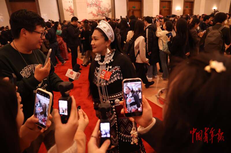 3月9日上午,十四届全国人大四次会议第二场“代表通道”集中采访活动在人民大会堂举行。全国人大代表、广西崇左市高级中学副校长黄花春回答记者提问。中青报·中青网记者 王鑫昕/摄