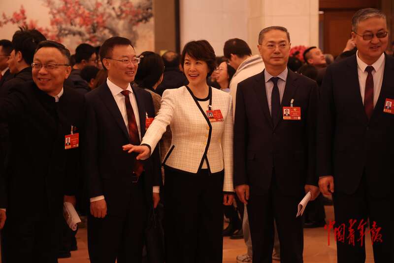 3月9日上午,十四届全国人大四次会议第二场“代表通道”集中采访活动在人民大会堂举行。会议开始前,一些全国人大代表和全国政协委员合影留念。中青报·中青网记者 王鑫昕/摄