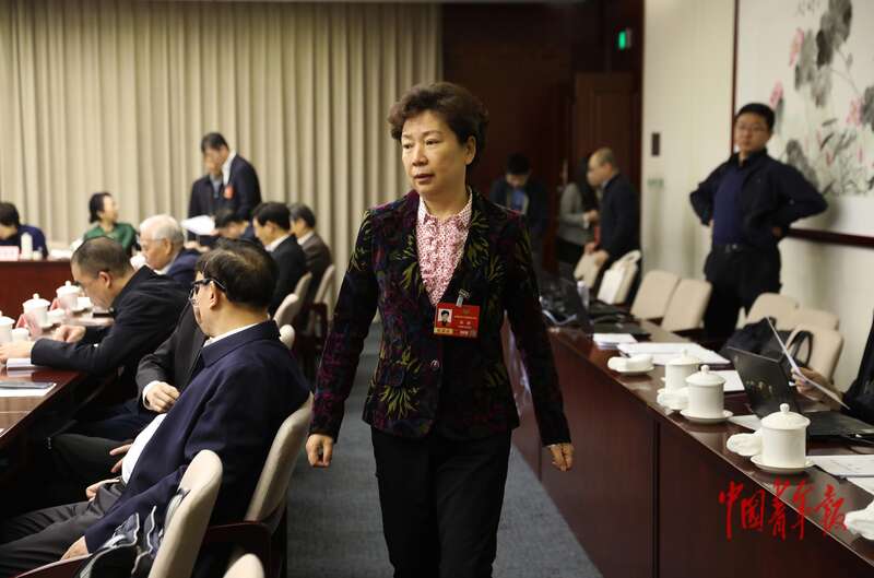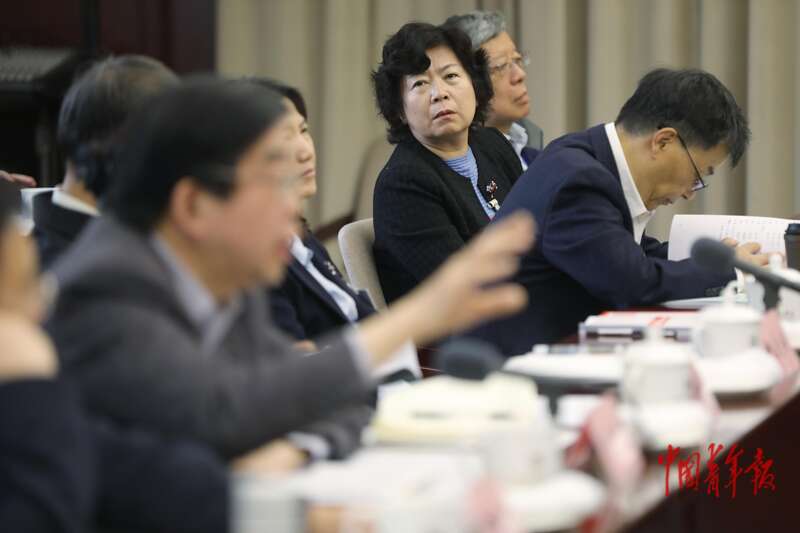 3月10日,北京会议中心,全国政协十四届四次会议民进界别小组会,全国政协委员王春秀(右三)转头看向正在发言的委员。中青报·中青网记者 陈剑/摄