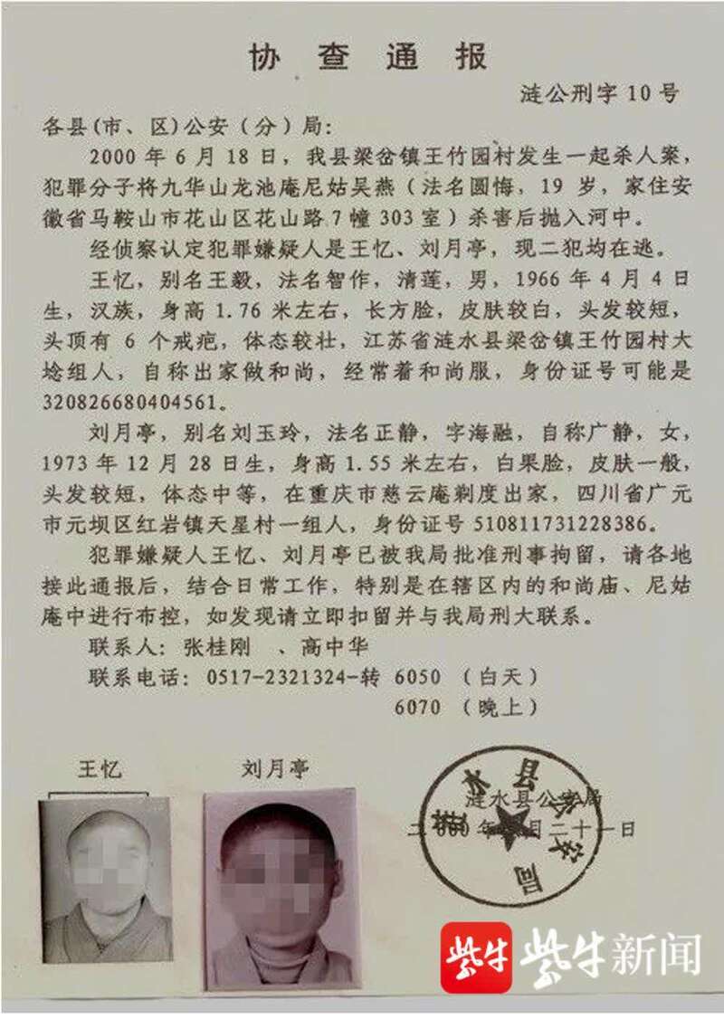 时间追溯到2000年6月的一天,涟水县梁岔镇陈溪村境内东张河内发现一具高度腐烂的女尸,经初步勘查和尸体检验后证实系他杀。案发后,淮安市、县两级公安机关迅速抽调精干警力成立“2000.6.18”专案组,开展侦破工作,通过连续数日的现场勘验、调查走访和重点摸排等大量工作,最终锁定刘月亭(女,当年27岁、四川广元人,法名正静,字海融,自称广静)、王忆(男,当年32岁,涟水人、别名王毅,法名智作、清莲)两人有重大作案嫌疑。