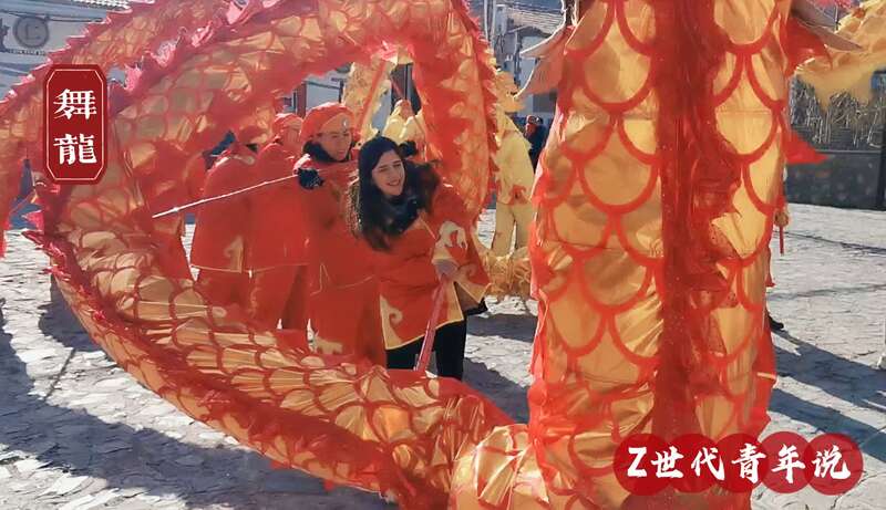 姐妹花加入了由村民们组成的舞龙排练队,在锣鼓声中和村民们一起挥舞手棒,感受舞龙迎新春的欢腾喜悦。