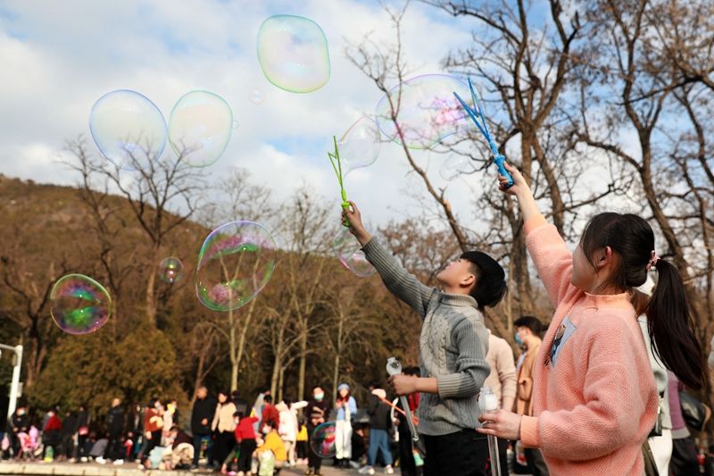 2021年2月12日,安徽淮北,两名儿童在相山公园玩泡泡。