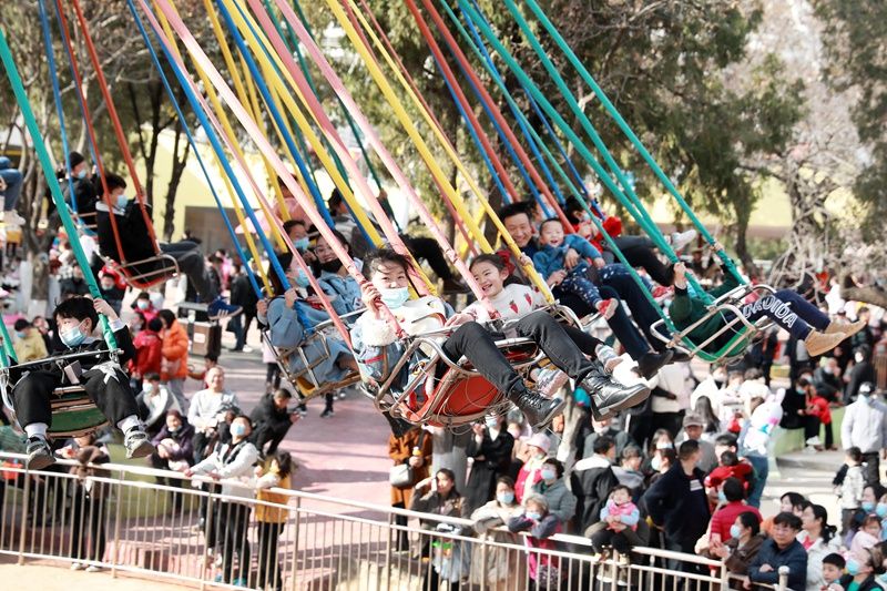 2021年2月12日,安徽淮北,市民在相山公园体验游乐项目。