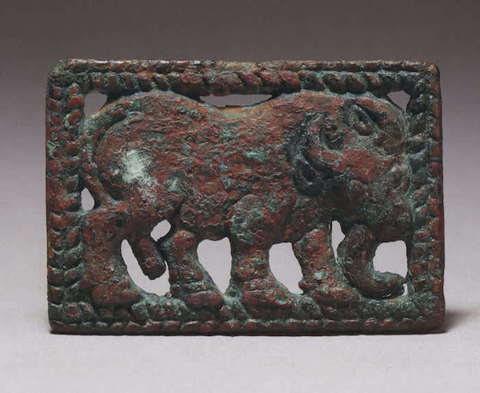 中国幅员辽阔,牛不仅是中原农业文明的象征,也是草原游牧文明标志性的牲畜。北朝民歌《敕勒川》唱到“天苍苍、野茫茫,风吹草低现牛羊”,牛和羊是草原游牧民族最主要的生产和生活资料。草原民族对牛的喜爱,不仅体现于日用器皿,还大量使用于服饰中。从春秋、战国时期开始,草原地区就流行一种动物纹牌饰。这种牌饰是草原民族最重要的服饰特征,它是一种腰带上的装饰物,往往与带扣配合使用。最初固定在腰带正中位置,逐渐向腰部两侧扩展,最后形成环绕腰带一圈的带銙。