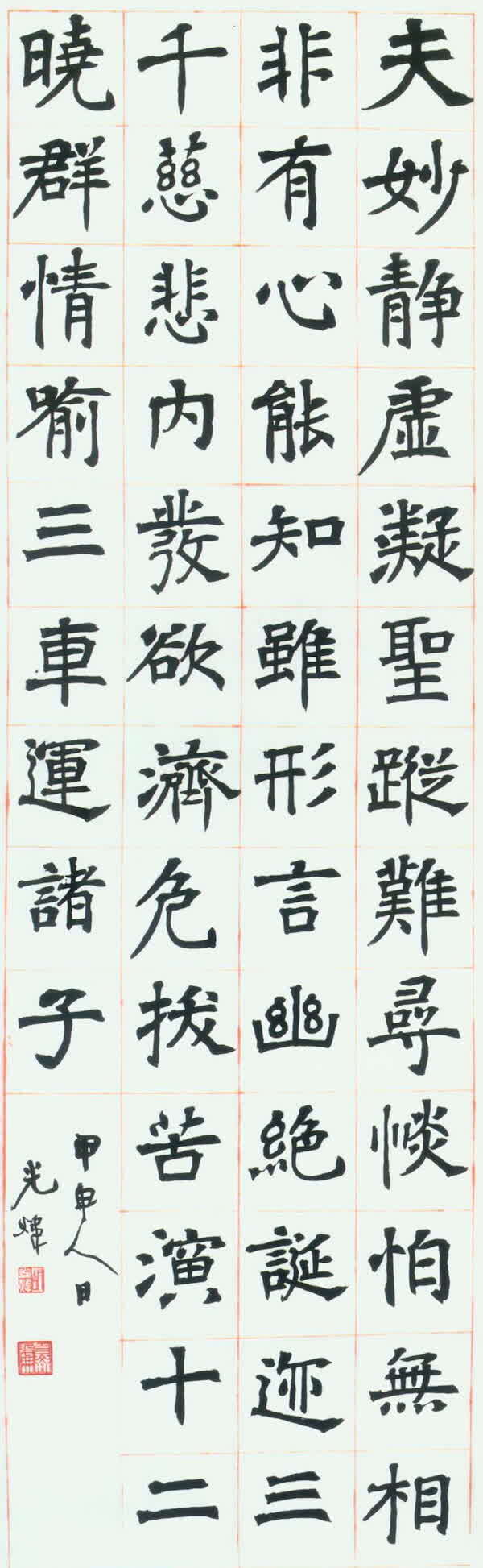 释文:夫妙静虚凝,圣踪难寻。惔怕无相,非有心能知。虽言幽绝,诞迹三千。慈悲内发,欲济危拔。苦演十二晓,群情喻三车。运诸子。甲申人日。光炜。