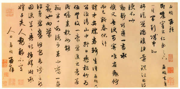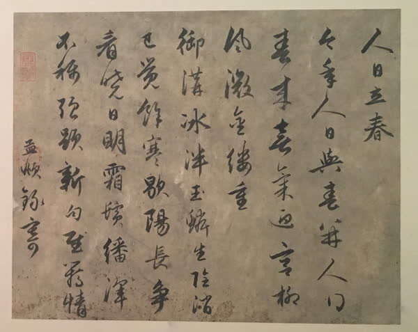 释文:人日立春。今年人日与春并,人得春来喜气迎。宫柳风微金缕重,御沟冰泮玉鳞生。阴消已觉余寒散,阳长争看晓日明。霜鬓彩幡浑不称,强题新句慰羁情。孟頫录寄。
