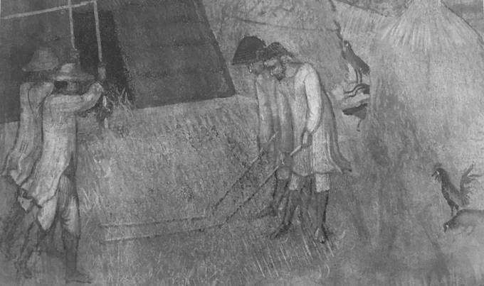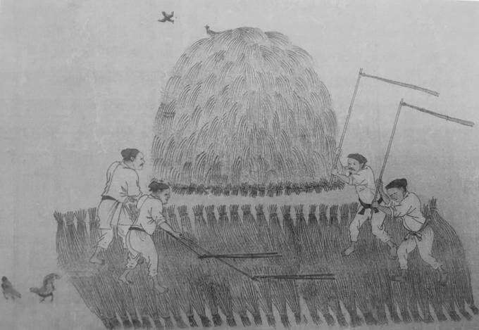 意大利画作《好政府的寓言》(上图)和中国古代画作《耕织图》中都有连枷打谷的场景。意大利画作连打谷场旁边的两只鸡都模仿了。