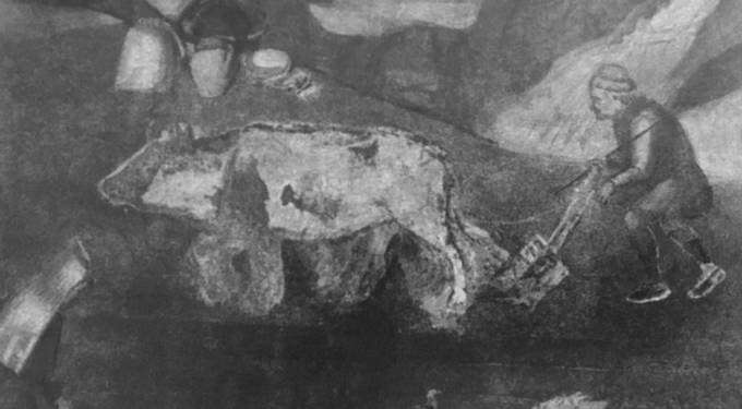 沃渣借鉴了过去年画中牛的形象,用简洁的线条,画出了被后人称为最早的一张新年画《春耕图》。这种新年画与旧年画的仕女娃娃、风俗戏曲不同,被群众称为“翻身年画”。此后,每年春节,各解放区的美术工作者都会创作新年画,及时生动地反映解放区生产和斗争的成绩。