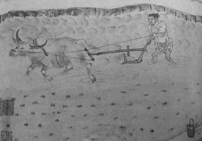 意大利画作《好政府的寓言》(上图)和中国古代画作《耕织图》中都有牛耕场景。与《耕织图》不同的是,意大利画作将喝水器具放在画面上方。