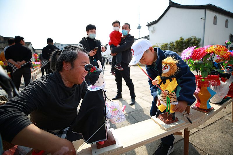 2021年2月24日下午,在浙江省东阳市卢宅景区内,灯架上的“人物走线木偶”别出心裁,有不同题材的小故事,吸引了不少市民前来把玩、拍照。