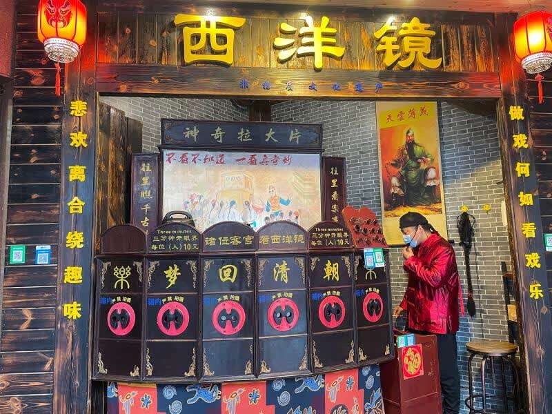 除了新鲜潮流,“老物件”也在豫园得其所哉。在非物质文化遗产“西洋镜”店铺门口,一排古典的木箱吸引了不少游客的目光。穿着长衫马褂的店员招呼记者坐下,随即演绎起了“拉洋片”手艺。透过箱子上的小洞,只见三打白骨精、水淹金山寺等传统民间故事在镜中上演。店员告诉记者,如今年轻人越来越多,“很多年轻人只知道‘拆穿西洋镜’,却不知道‘西洋镜’到底是什么,所以对我们的表演很感兴趣。”