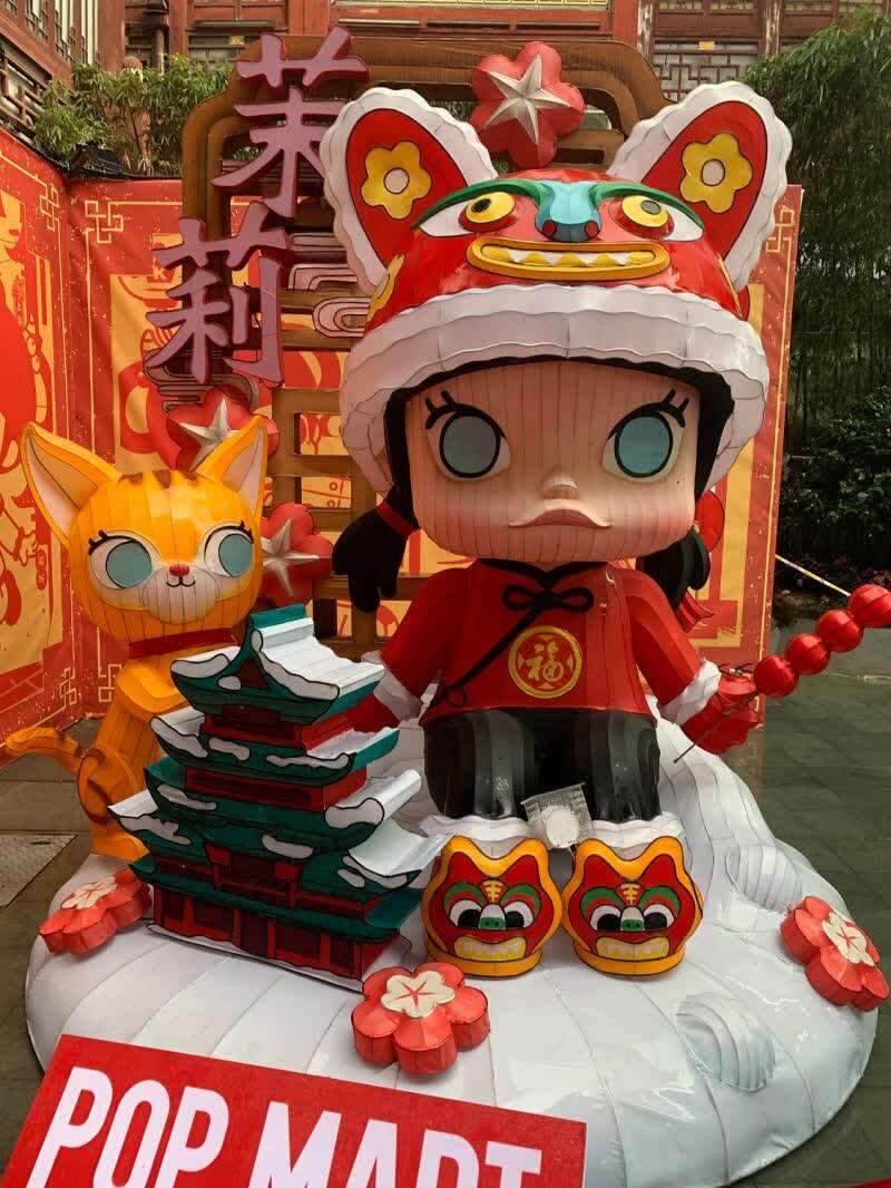 入夜,豫园九曲桥上亮起了无数花灯:钓鱼台、摇钱树、清明上河桥……这些花灯的原型来自于古风经营游戏《江南百景图》。一双湖绿眼睛的“茉莉”穿着具中国新年特色的服装,手里攥着一只冰糖葫芦——这是来自泡泡玛特的盲盒IP。