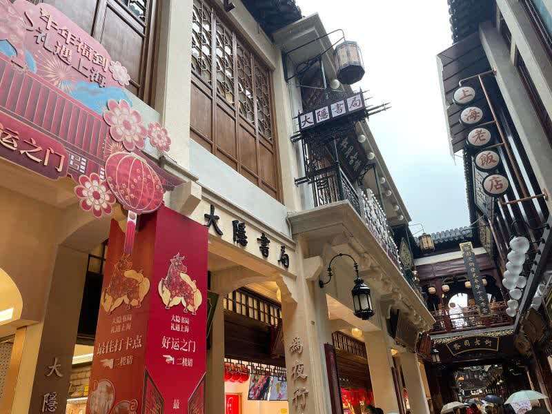 沈露上次来豫园已是五年前,她的印象中豫园还是“小商品市场”,景区小吃和商品千篇一律、价格昂贵。近日前来,她明显感到差别:“有很多新的店铺,尤其是一些特色店和快闪店,挺有意思。”记者在现场看到,奶糖“大白兔”和运动鞋“飞跃”开了联名店,可口可乐店铺能为消费者在易拉罐上DIY文字,手办和扭蛋店里挤满情侣,还有VR店可以“虚拟”赏灯。在网红书店大隐书局,店家还贴上“最佳打卡点”的牌子——站在这里,能找到最佳合影角度。