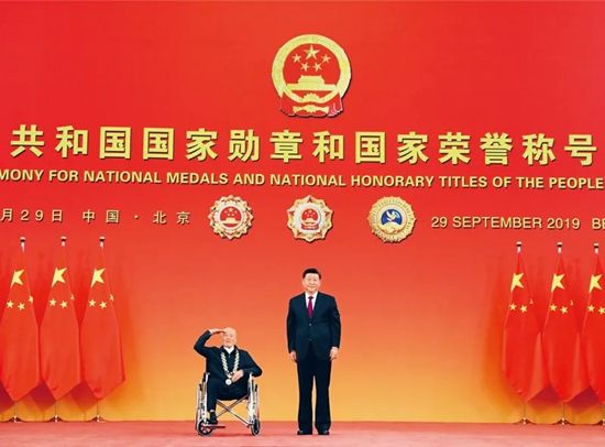 2019年9月29日,中华人民共和国国家勋章和国家荣誉称号颁授仪式在北京人民大会堂金色大厅隆重举行。中共中央总书记、国家主席、中央军委主席习近平向“共和国勋章”获得者张富清颁授勋章。新华社记者 王晔/摄